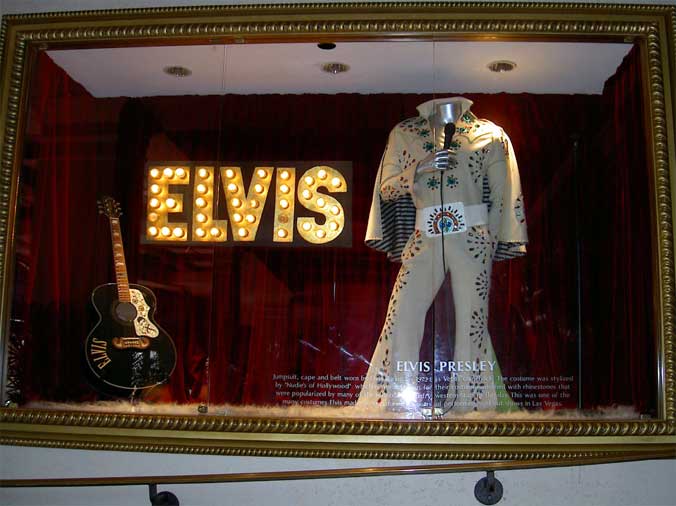 | オーランドの最初の宿泊地はユニバーサルスタジオ・オーランド。 ここはユニバーサルスタジオを中心に、ローラーコースター系、ウォーターシュート系の乗り物満載の遊園地と、映画館、ライブハウス、ナイトクラブ、レストラン、専門ショップなどが集まっている場所とが隣接して作られていて、複合レジャー施設になっているのだ。 ユニバーサルスタジオ・オーランドの敷地内には3軒のホテルがあり、最初の2泊をしたのはその中のひとつハードロックホテル。 そう! ここにはエルヴィスのジャンプスーツが飾られてるのだ。この情報だけで迷わず宿泊を決めたハードロックホテル! 夜遅くのチェックイン。エルヴィスのジャンプスーツはどこに飾られているのか。期待を胸にまずは荷物を部屋に放り込み、デジカメ片手に即行でゲストサービスへ向かう。 瞳が星になってる私に、さらに凄い情報が…。なんと敷地内のハードロックカフェに「エルヴィス・ルーム」があって、お宝がいっぱい展示されてると言う。 と、その前にジャンプスーツとギターをしっかり拝んでおかねばならない。 ショーケースの中はといえば、大きく「ELVIS」の文字が掲げられていて、 その右側にケープ付きジャンプスーツ(1972年ラスヴェガスで着用)、左側にはギターが立てかけられている。 |